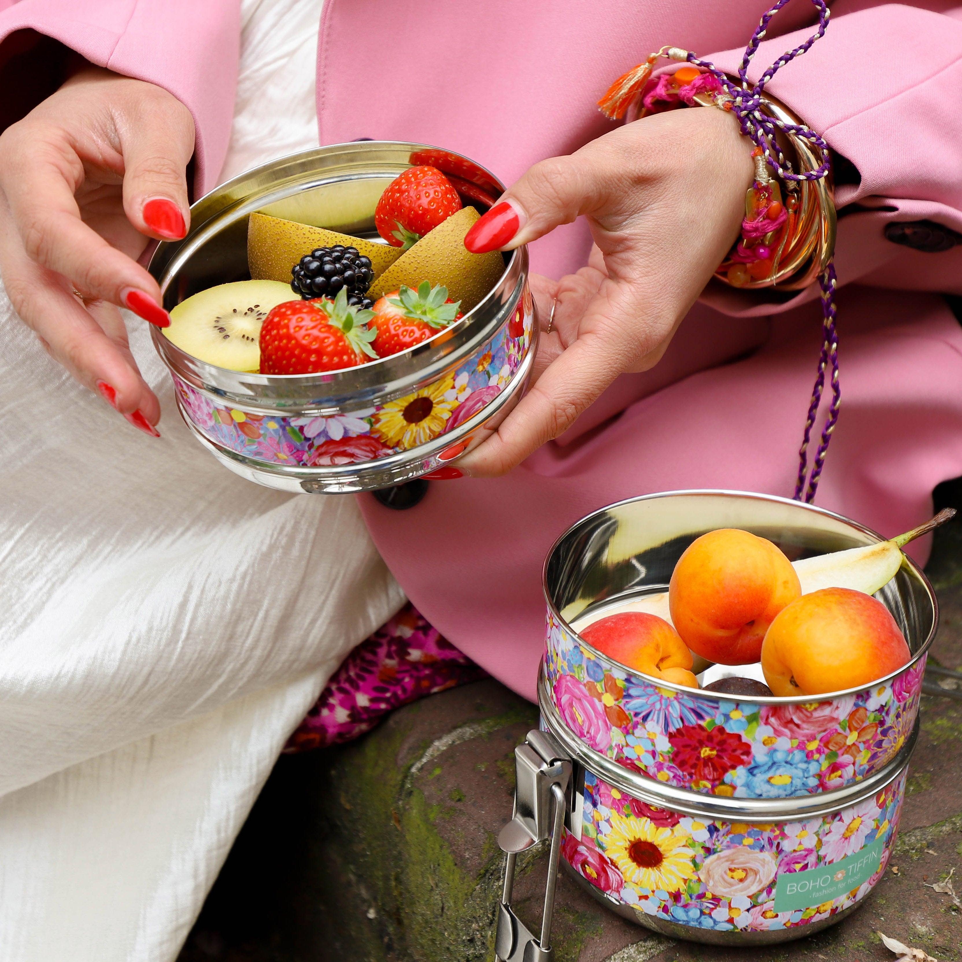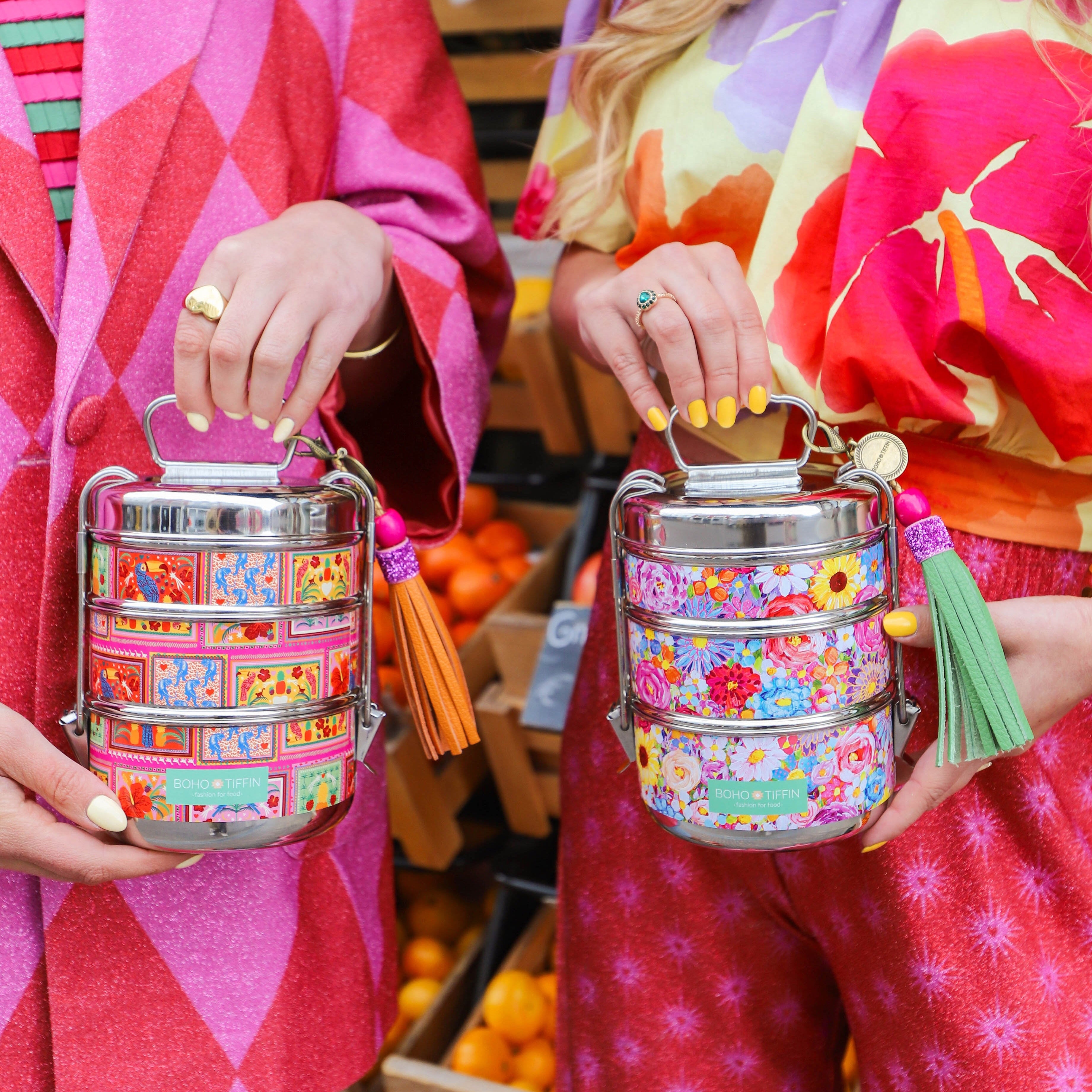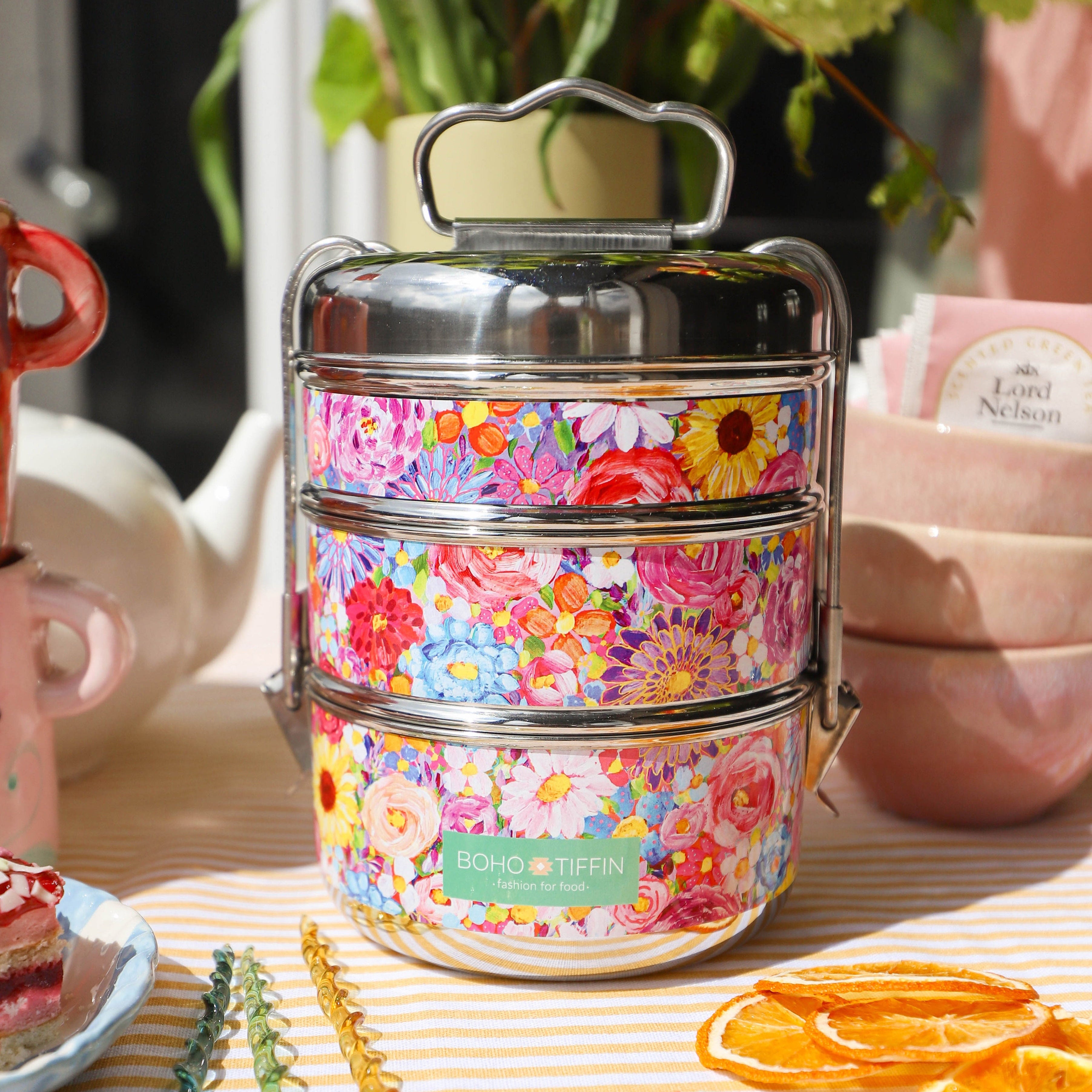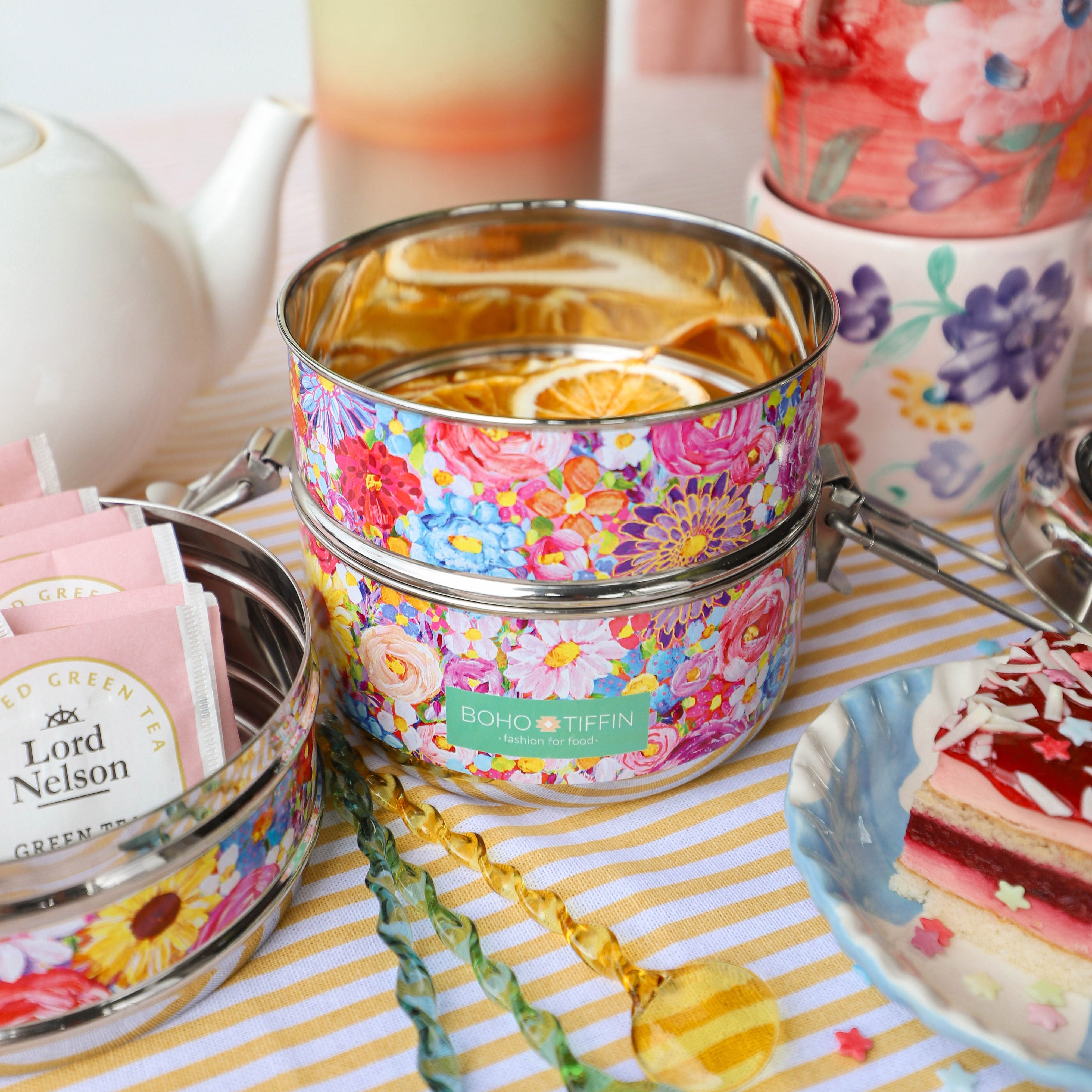 Onze BESTSELLER & Flowers all over ♡ Blij en vrolijk, dat word je van deze prachtige Sunny Flowers Boho-Tiffin, een duurzame lunchbox met een design van Luci Sterre.